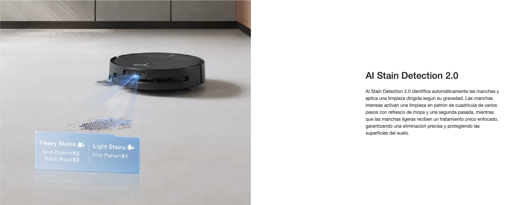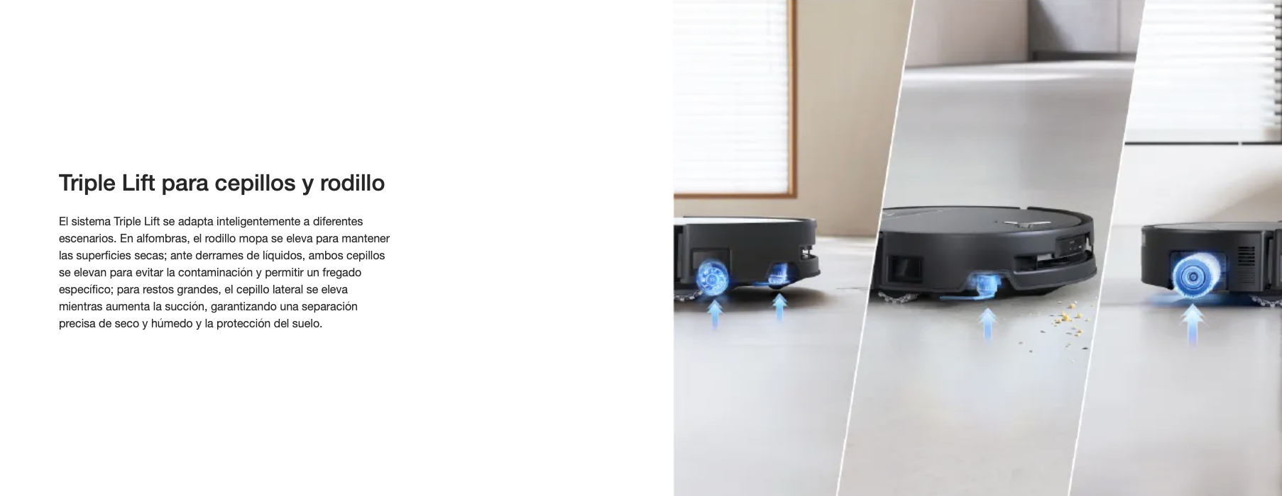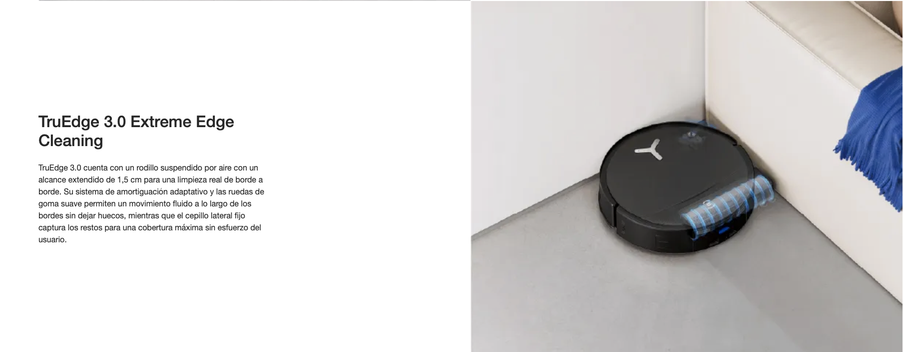 El OZMO ROLLER 2.0 ofrece 3.800 Pa de presión de limpieza y frota hasta 220 veces por minuto para eliminar las manchas difíciles, siendo a la vez suave con los suelos y proporcionando un acabado sin marcas. TruEdge 3.0 Extreme Edge Cleaning, que cuenta con un rodillo extensible de 1,5 cm, un sistema de amortiguación adaptativo en tiempo real y ruedas de deslizamiento por bordes de goma suave, garantiza una cobertura real de borde a borde sin huecos. El sistema Triple Lift para cepillos y rodillo se adapta automáticamente a alfombras, derrames y restos grandes, ofreciendo una limpieza precisa mientras protege los suelos y evita la contaminación cruzada.