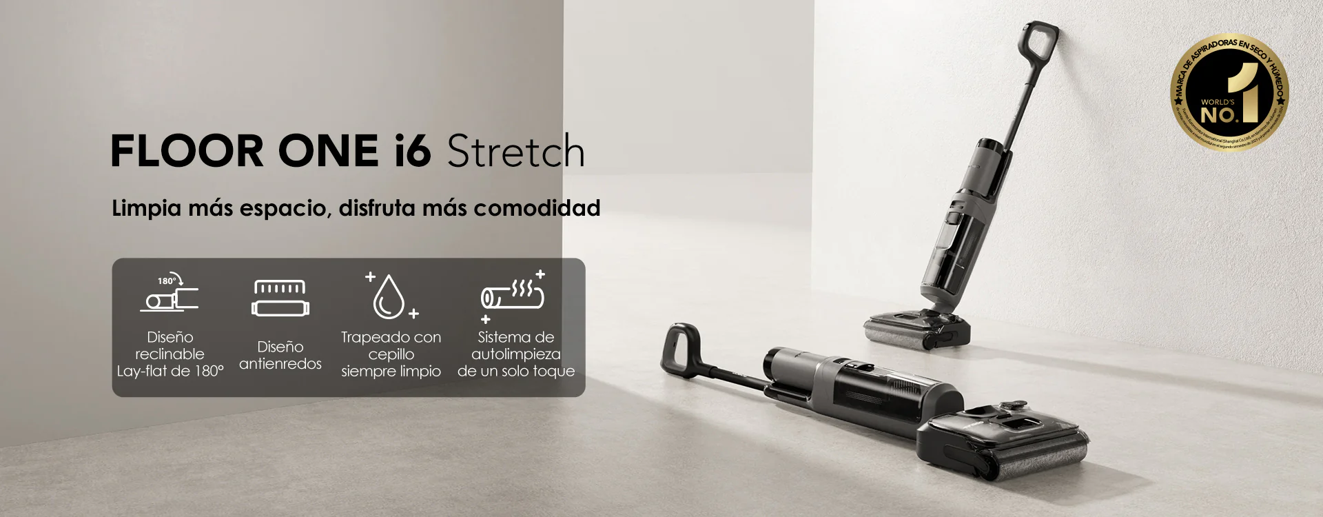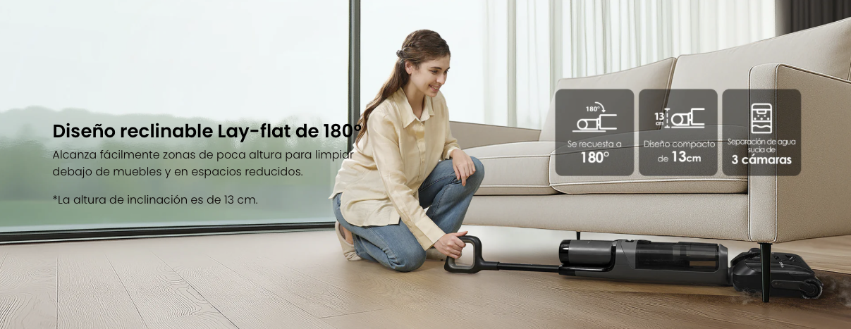 La máquina se puede reclinar hasta 180° para llegar a una altura de tan solo 13 cm, lo que facilita la limpieza en zonas bajas y la eliminación del polvo oculto, garantizando que ningún rincón de la casa quede sin limpiar.