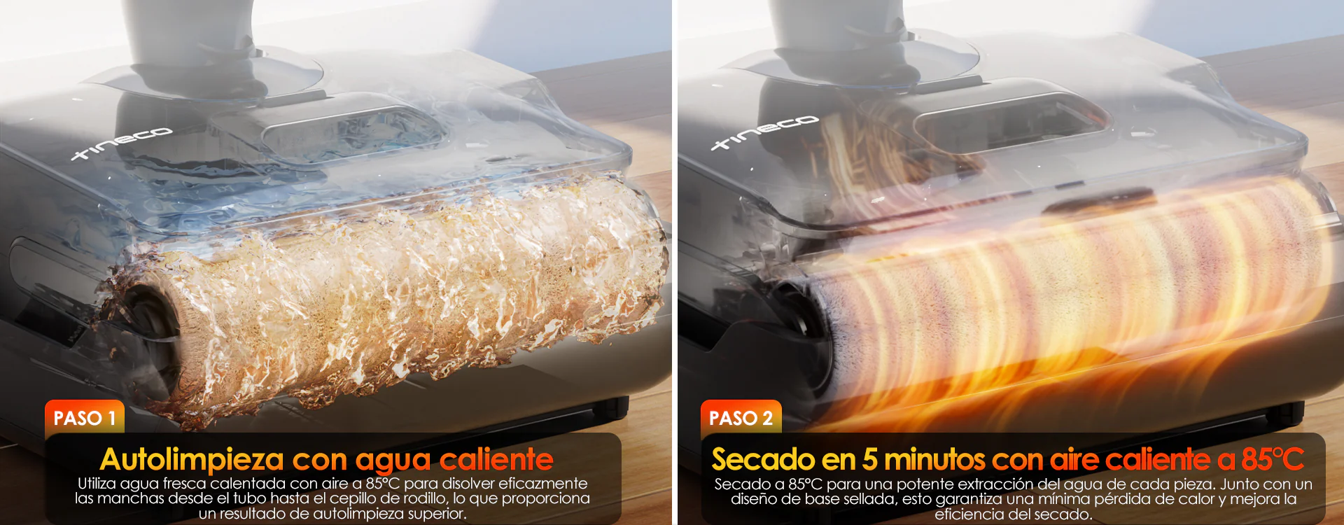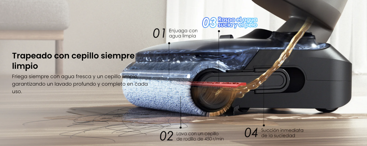Con el sistema de autolimpieza con agua caliente de un solo toque, el cepillo de rodillo, la entrada de succión y la cubierta se limpian a fondo, seguido de un secado rápido a alta temperatura en 5 minutos, restaurando el cepillo de rodillo a un estado limpio y seco.