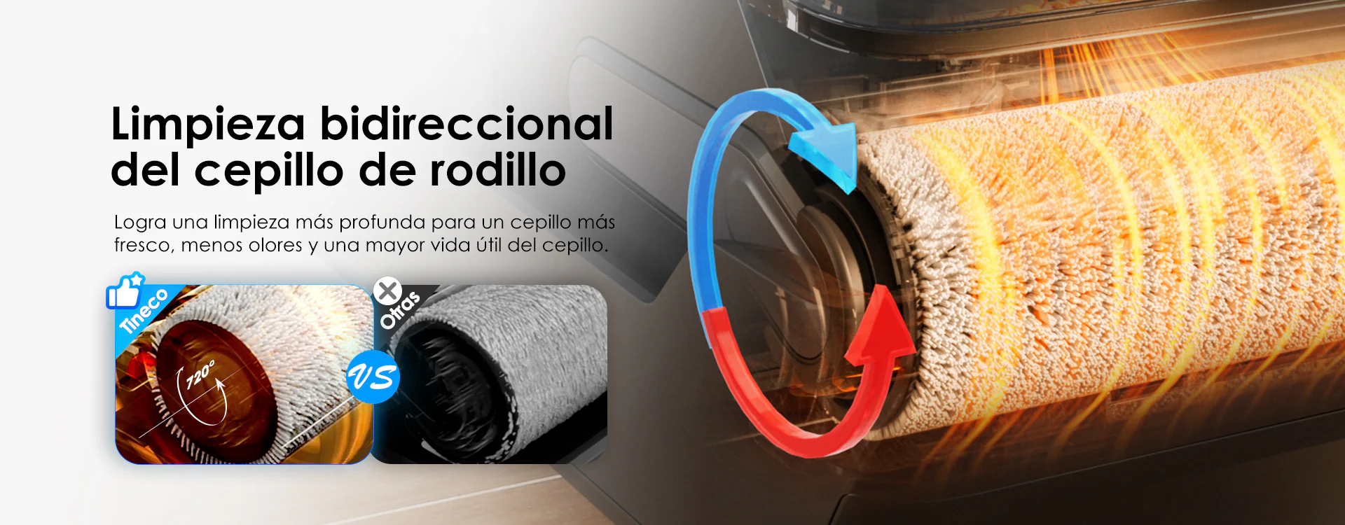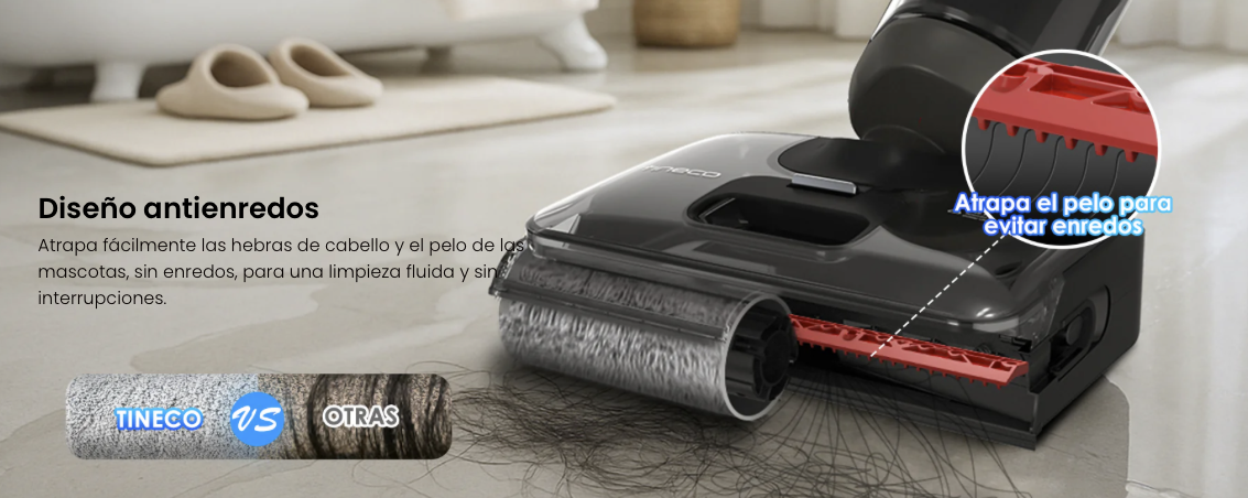 Intercepta con facilidad las hebras de cabello y el pelo de las mascotas, sin enredarlos, succionándolos directamente al depósito de residuos, lo que garantiza una limpieza fluida y continua.