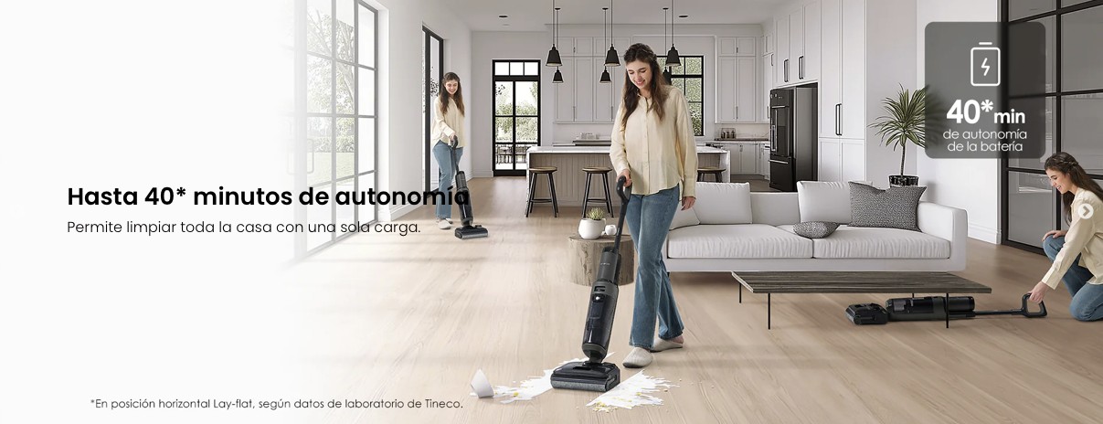 Una sola carga permite 40 minutos de uso continuo, lo que facilita la limpieza de diversas áreas del hogar sin necesidad de recargas frecuentes. *Basado en datos de laboratorio de Tineco. Alcanza sin problemas para limpiar el piso de una casa de 250 metros cuadrados.