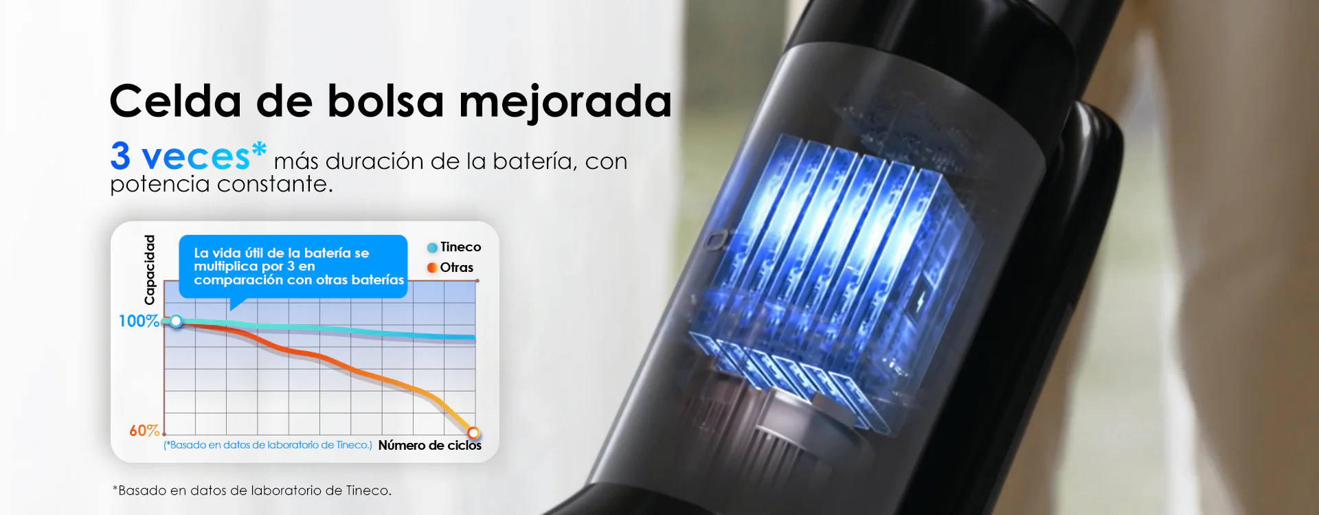 Viene con paquetes de baterías Pouch Cells, con hasta 900 ciclos de carga antes de comenzar a decaer paulatinamente su capacitad de carga. Esto hace que la vida útil de la batería sea hasta 3 veces más que las baterías de otras aspiradoras inalámbricas.